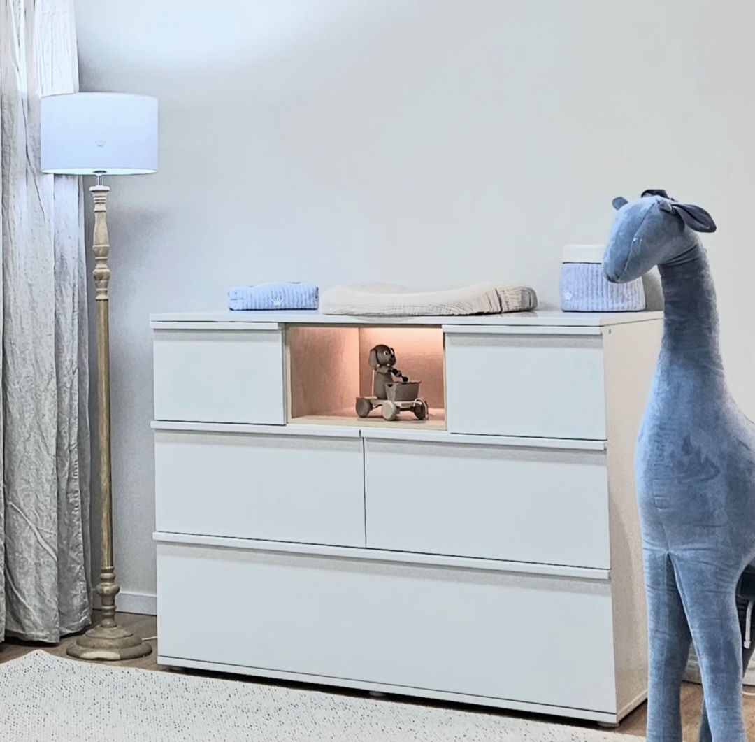 שידת אמיליה – לשידה הייחודית נפח אחסון רב, במגירה העליונה מגש טיפולים לנוחיות מקסימלית.